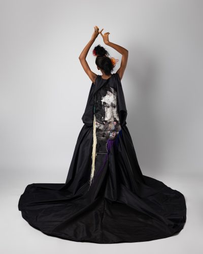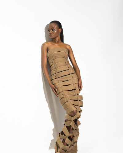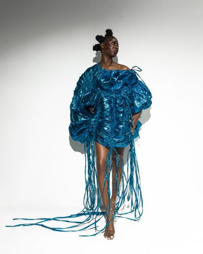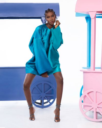 USD250.00 – USD350.00A Bermuda length dress cut from a beautiful shimmery fabric featuring a statement sleeve and an off shoulder for every lady who loves to make a statement.